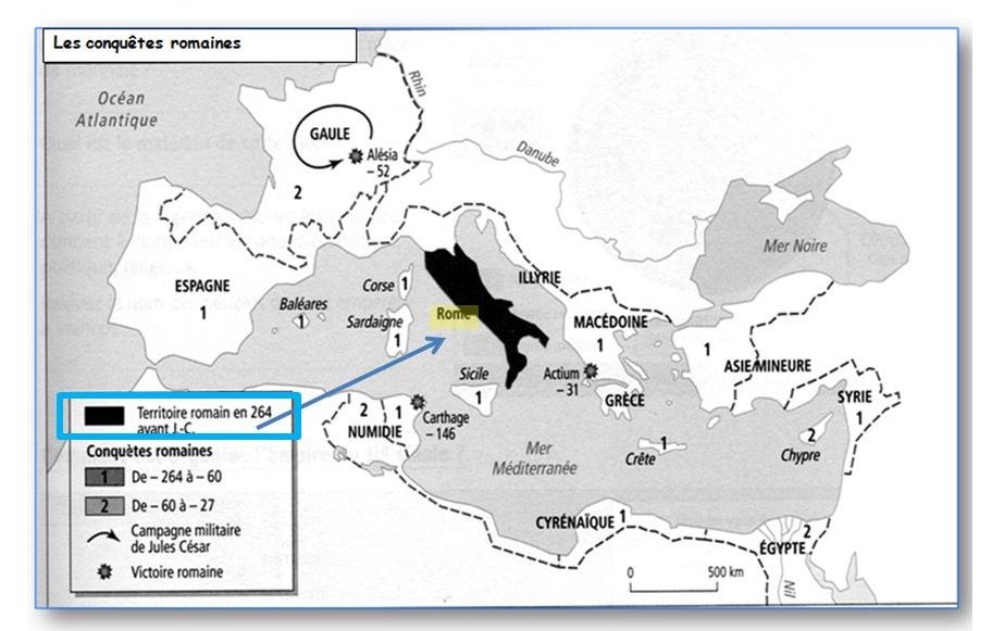 En - 264 Rome a conquis toute l'Italie. Puis c'est le bassin méditerranéen. L'Empire à son apogée va de la Bretagne à l'Egypte.